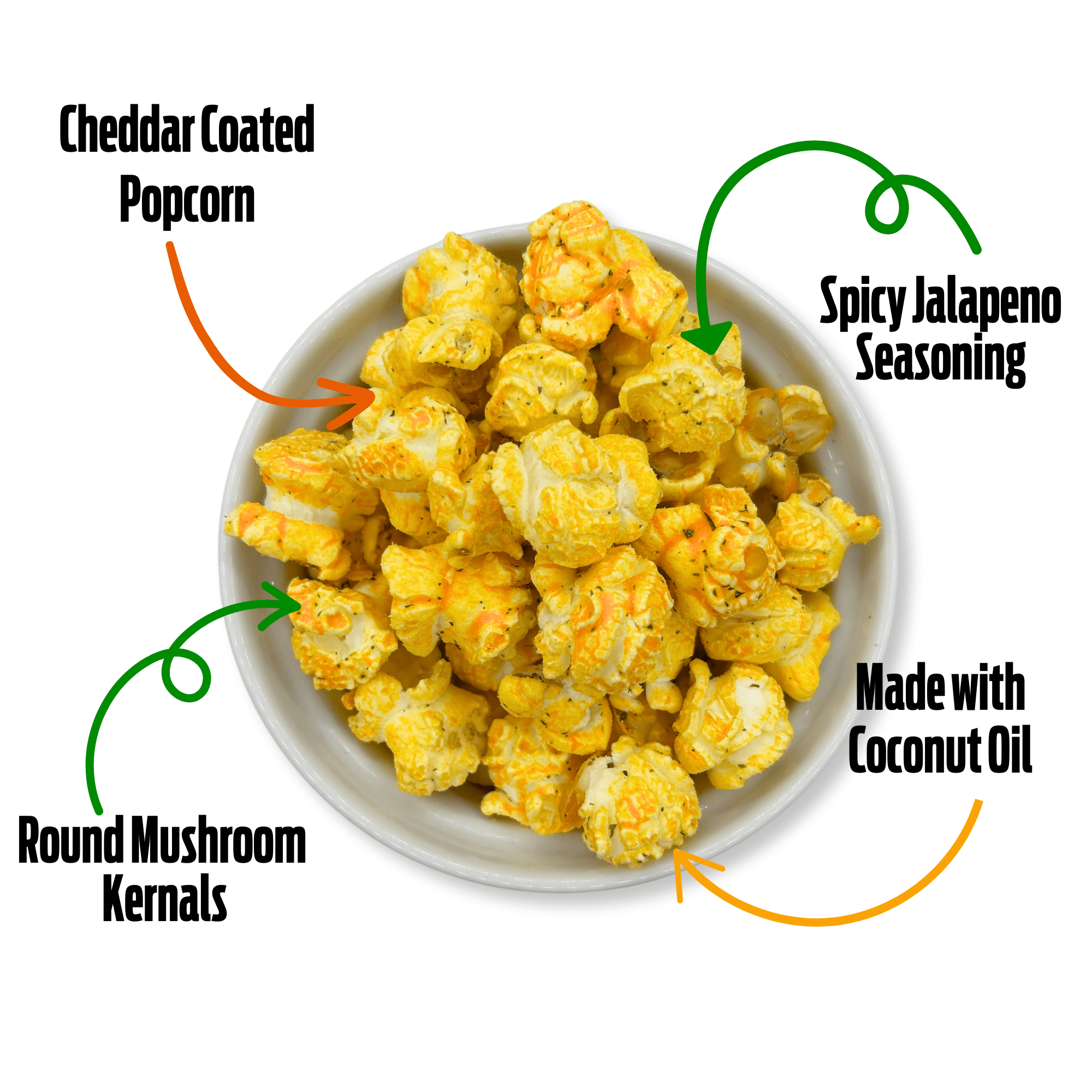 Classic Cheddar coated popcorn with the addition of a spicy jalapeño seasoning, perfect for the spicy cheesy combo. Non-GMO Popcorn - Gluten Free Indulge in the irresistible flavors of our Premium Gourmet Popcorn! Each batch is meticulously handcrafted using the finest ingredients to deliver a mouthwatering experience that’s perfect for any occasion. Whether you’re treating yourself or looking for a thoughtful gift, our gourmet popcorn is sure to delight. Product Highlights: • Artisan Crafted: Each flavor is handmade in small batches to ensure the highest quality, freshness, and consistency. • Perfect for Gifting: Beautifully packaged, our popcorn gifts makes an ideal present for birthdays, holidays, or just because. • Satisfaction Guaranteed: We stand by our product and are confident you’ll love every bite.
