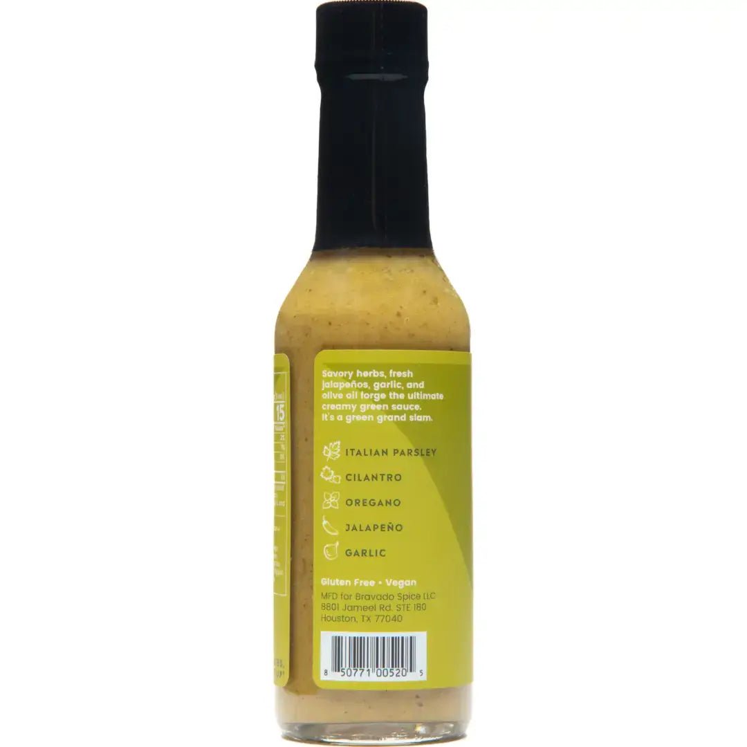 Savory herbs, fresh jalapeños, garlic, and olive oil forge the ultimate creamy green sauce. It’s a green grand slam. Heat Level: MILD Red Wine Vinegar Pure Olive Oil Jalapeño Peppers Garlic (Garlic, Water) Parsley Sea Salt Sunflower Lecithin Black Pepper Crushed Red Pepper Cilantro Oregano We don't use dyes or artificial preservatives in any of our products. Just as Mother Nature intended.