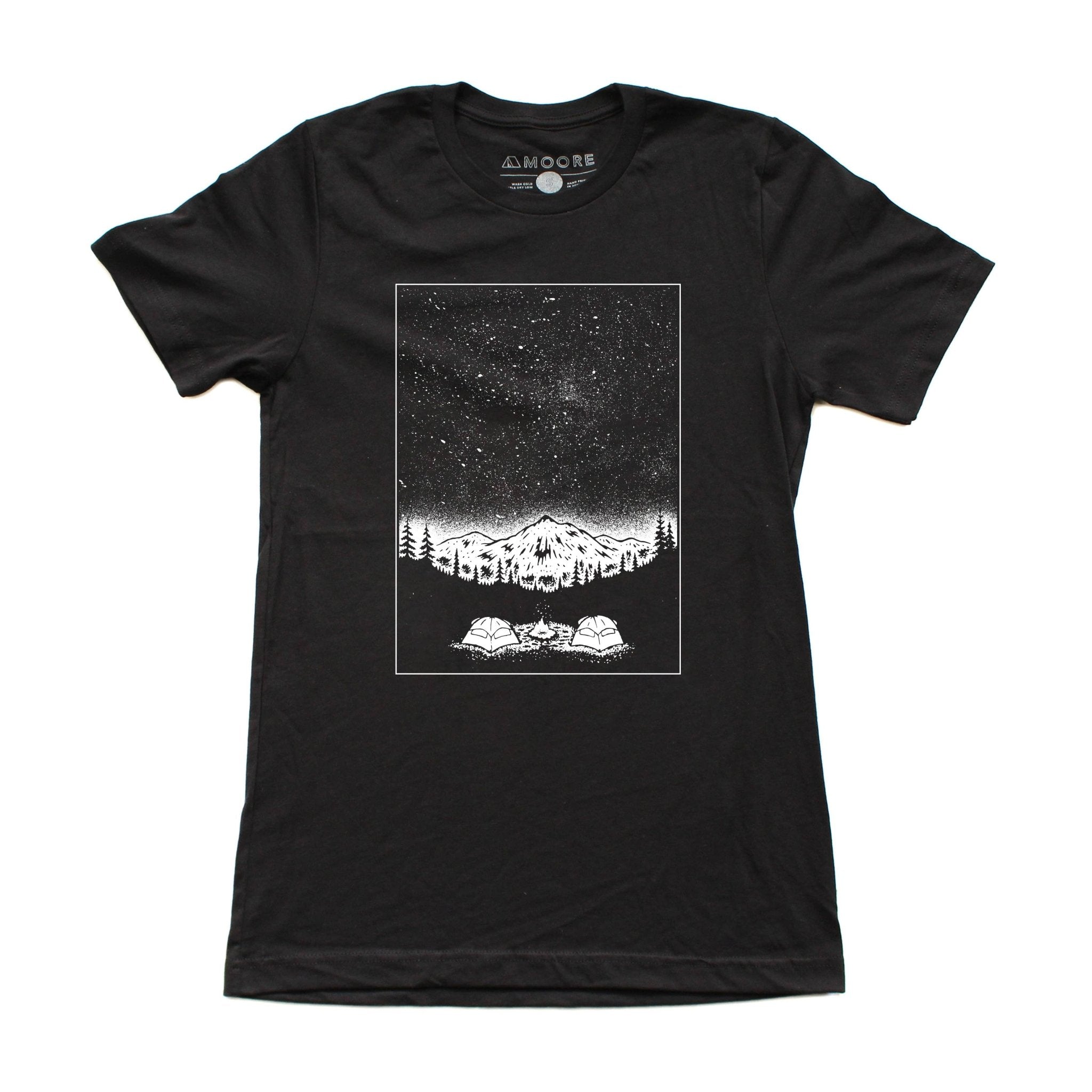 Our Night Tee in black is a screen printed t shirt with a white water-based ink. With a retail fit, this incredibly soft t shirt is made out of a 100% ringspun cotton.. Our soft mens t shirts are unisex in wear. Washing instructions: Machine wash with cold water. Tumble dry low or air dry. Made by Moore: This t shirt was hand screen printed with care in our workshop in Denver, Colorado.