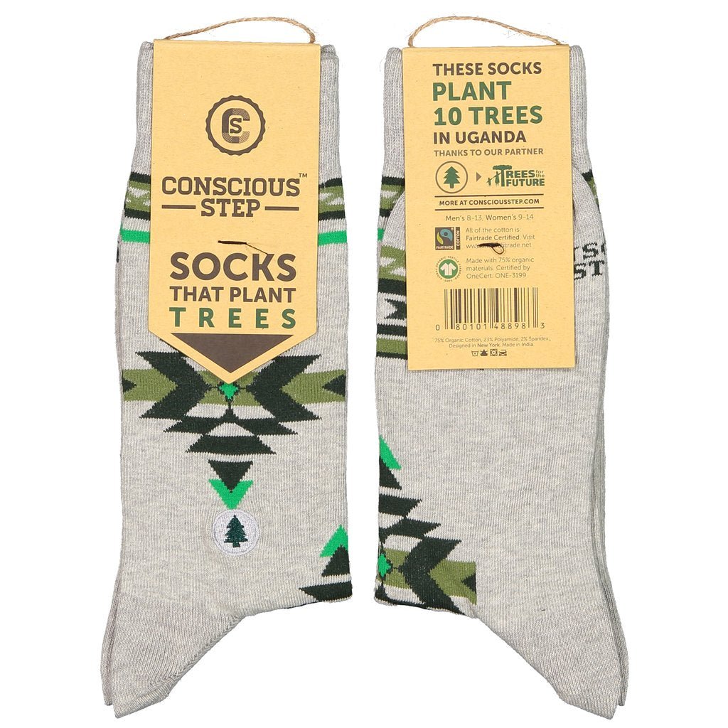 Go green and plant trees! Featuring a green aztec design on grey, these socks plant ten trees through our partner Trees for the Future. This pair is perfect for adding a bold pop to your outfits. Show your love for keeping our planet green with Socks that Plant Trees. Available in two sizes. • Sustainable • Certified Organic • Certified Fairtrade • Certified Vegan • Members of 1% for the Planet